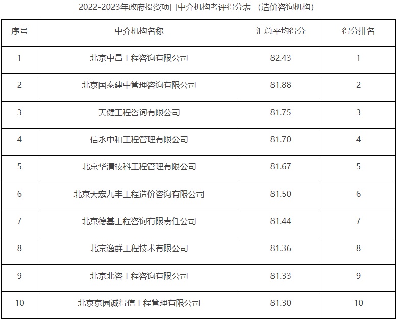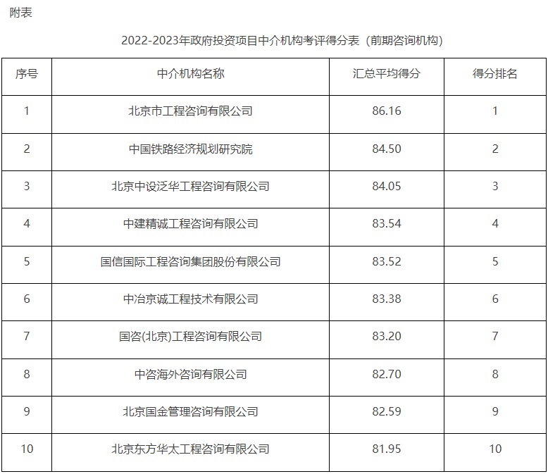 为进一步规范咨询评估工作,保障投资咨询评估质量,按照《北京市发展和改革委员会固定资产投资项目咨询评估管理办法》(京发改办〔2022〕17号)规定,经对2022年5月至2023年4月各中介机构咨询评估工作评价进行汇总考评,决定对排名靠前的北京市工程咨询有限公司、中国铁路经济规划研究院、北京中设泛华工程咨询有限公司等20家中介机构予以通报表彰。(详见附表)