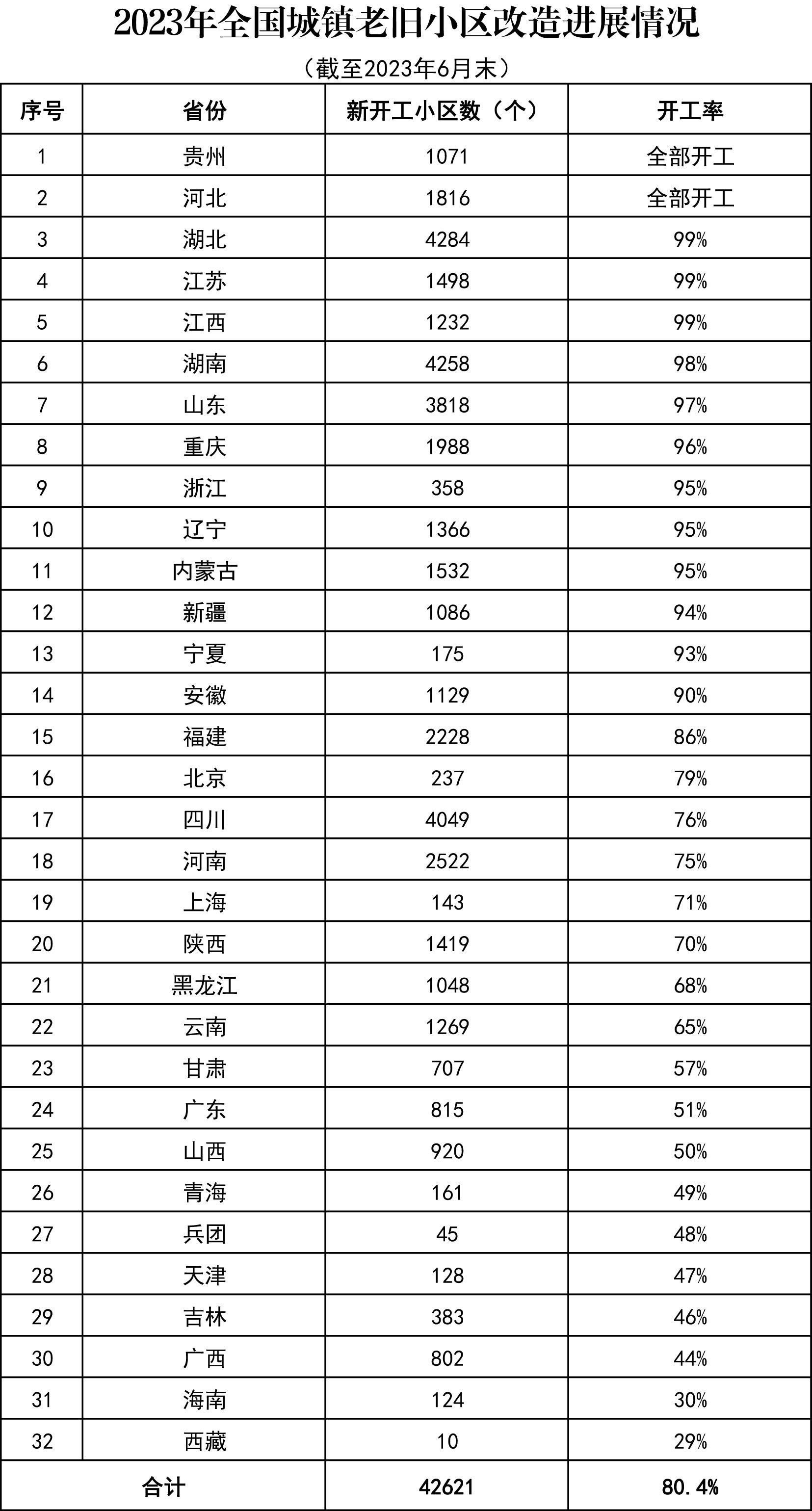 2023年,全国计划新开工改造城镇老旧小区5.3万个、涉及居民865万户。根据各地统计上报数据,1—6月份,全国新开工改造城镇老旧小区4.26万个、惠及居民742万户,按小区数计开工率80.4%。分省看,贵州、河北、湖北、江苏、江西、湖南、山东、重庆、浙江、辽宁、内蒙古等11个省份开工率超过95%。