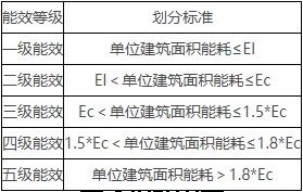 京发改〔2023〕479号中规定:正在修订的北京市地方标准《民用建筑能耗指标》(DB11/T 1382)将分类型明确单位建筑面积能耗约束值(为实现建筑使用功能所允许消耗的建筑能耗指标上限值,即Ec)和引导值(在实现建筑使用功能的前提下,综合高效利用各种建筑节能技术和管理措施,实现更高建筑节能效果的建筑能耗指标期望值,即El)。参照该地方标准,将公共建筑能效等级分为五级,一级能效为最优级,五级能效为单位建筑面积能耗超过1.8倍约束值。