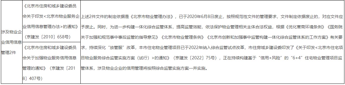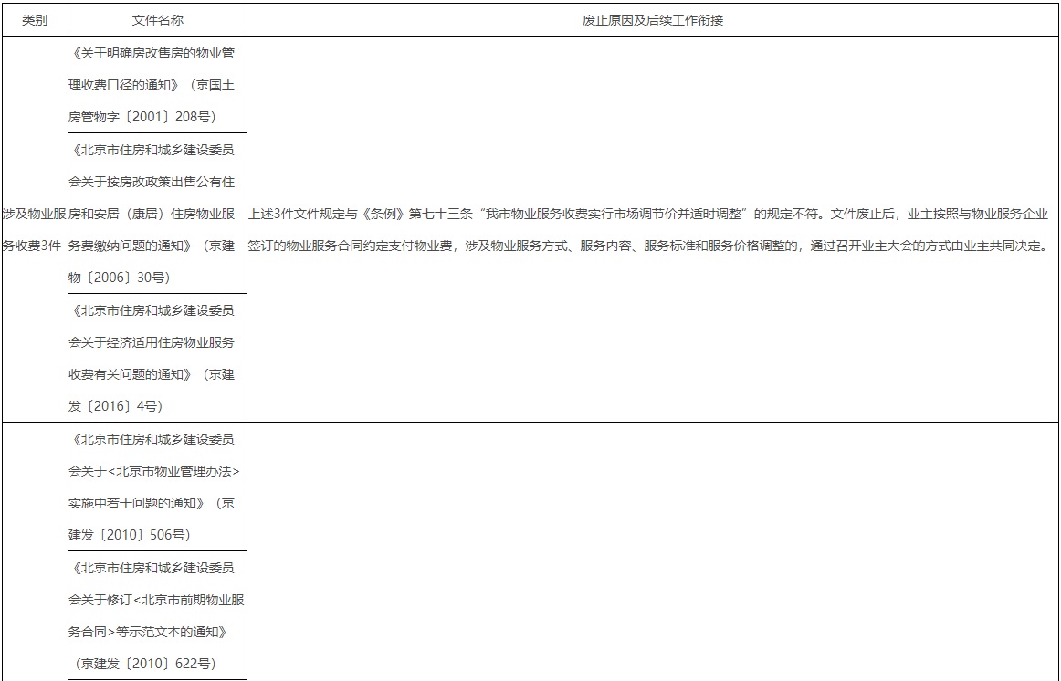本次废止的12个文件主要涉及物业服务收费、《北京物业管理办法》配套文件、物业服务企业信用信息管理等三个方面内容,具体文件名称、废止原因及后续工作衔接见附表,以上文件废止后,12个文件相对应的政策解读同步废止。