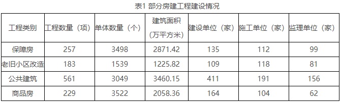 一季度,全市16个区和北京经济技术开发区在施房建和市政工程共计3225项,其中房建工程共计2723项、15545 个单体、在建面积12228.9万平方米,涉及1934家建设开发企业、1147家施工企业、301家监理企业。市政基础设施工程共计502项、4052个单体,涉及162家建设开发企业、184家施工企业、112家监理企业。部分房建工程建设情况见表1。