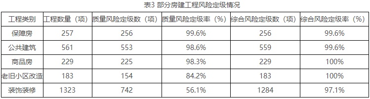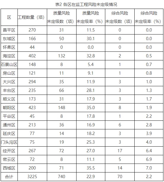 一季度,全市16个区和北京经济技术开发区3225项在施工程,开展质量风险定级的在施工程2485项,定级率77.1%;综合风险定级的在施工程3155项,定级率97.8%,各区工程风险未定级情况见表2。房建工程2723项,开展质量风险定级的在施工程2056项,定级率75.5%;开展综合风险定级的在施工程2674项,定级率98.2%。全市综合风险定级完成率较高的区:昌平区、怀柔区、东城区,综合风险定级完成率较低的区:经开区、密云区、西城区。部分房建工程风险定级情况见表3。
