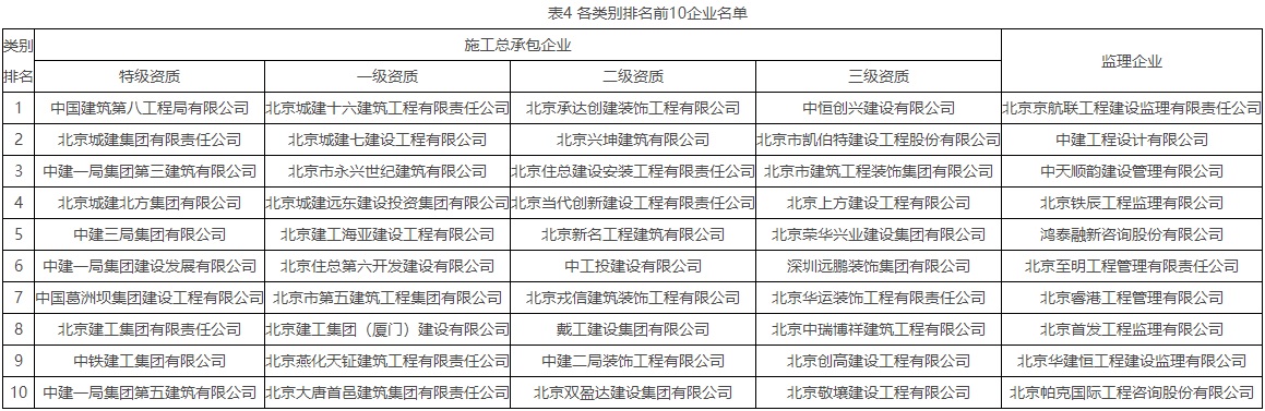 依据《关于进一步加强北京市房屋建筑和市政基础设施工程企业和注册人员市场行为信用评价工作的通知》(京建发〔2022〕69号)、《关于调整北京市房屋建筑和市政基础设施工程项目动态评价管理机制的通知》(京建发〔2023〕34号),一季度全市在施工程项目安全质量状况测评和智慧工地创建评价结果应用于全市建筑业企业和注册人员市场行为信用评价,推动施工现场和建筑市场“两场联动”落地落实。一季度,全市3225项房建和市政工程项目纳入动态评价范围,涉及施工总承包企业1238家,监理企业359家,监理工程师、注册建造师共4497人。部分排名较好的企业见表4。