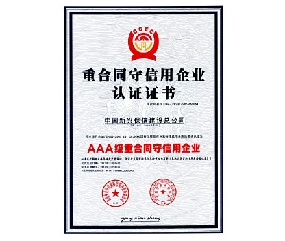 日前,中国新兴保信建设总公司再次被中国信用评价协会认证为《AAA级重合同守信用企业》,此次认证认可中国新兴保信建设总公司产品质量信用、财务信用、知识产权信用、合同履约信用,为中国新兴保信建设总公司参与工程投标资格审查提供资信支持,提高了市场竞争力。 中国新兴保信建设总公司一贯注重诚信经营,依靠健全的管理体系、人性化的管理理念,不断提高企业的社会影响力和市场美誉度,努力打造良好的央企品牌形象。