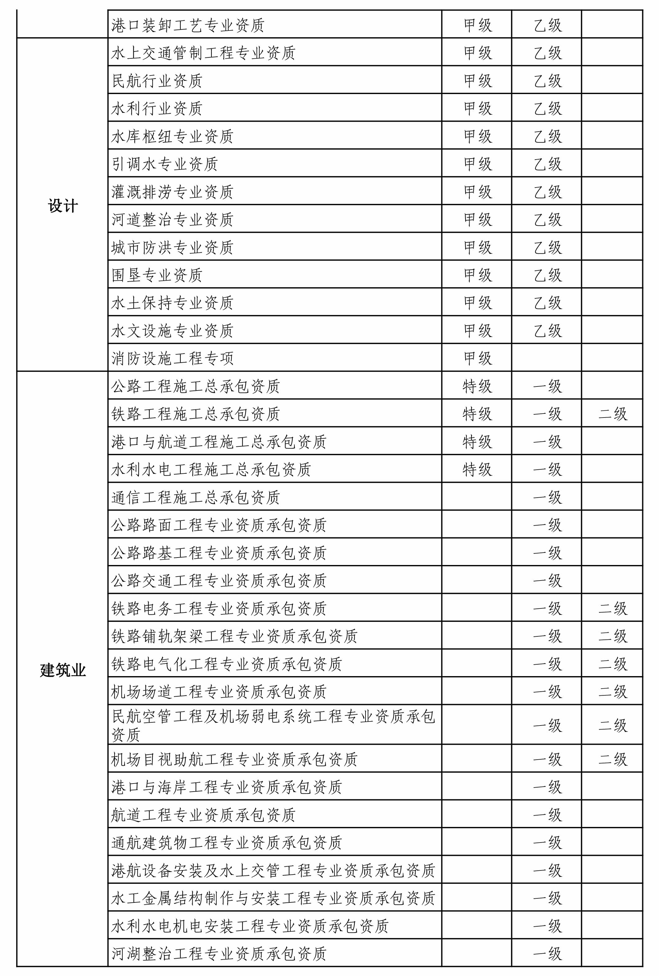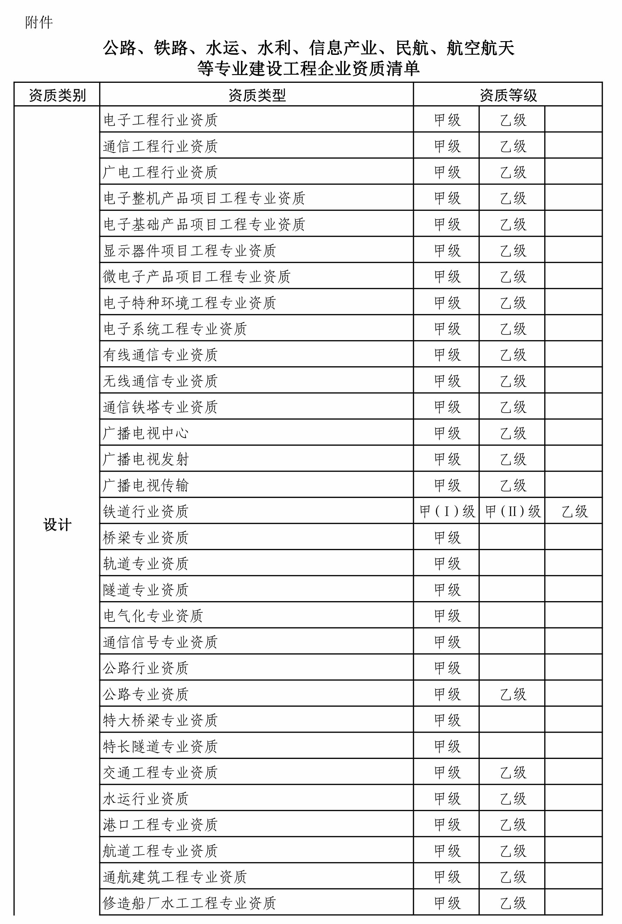 附件:公路、铁路、水运、水利、信息产业、民航、航空航天等专业建设工程企业资质清单