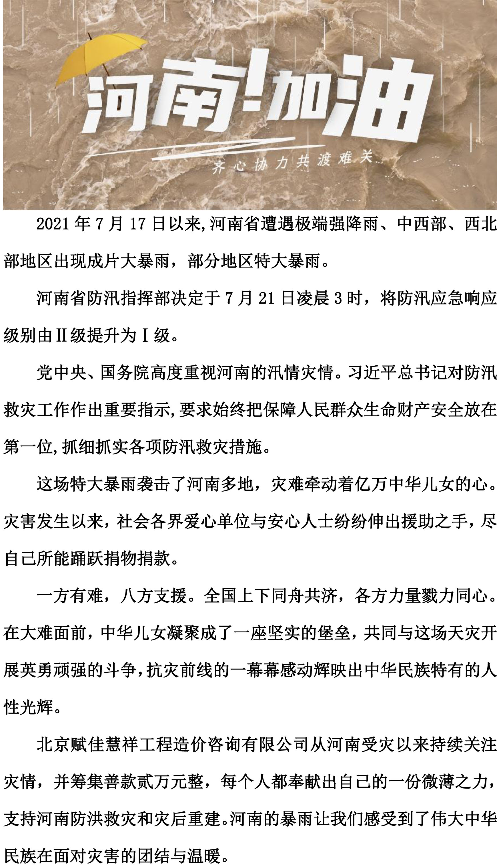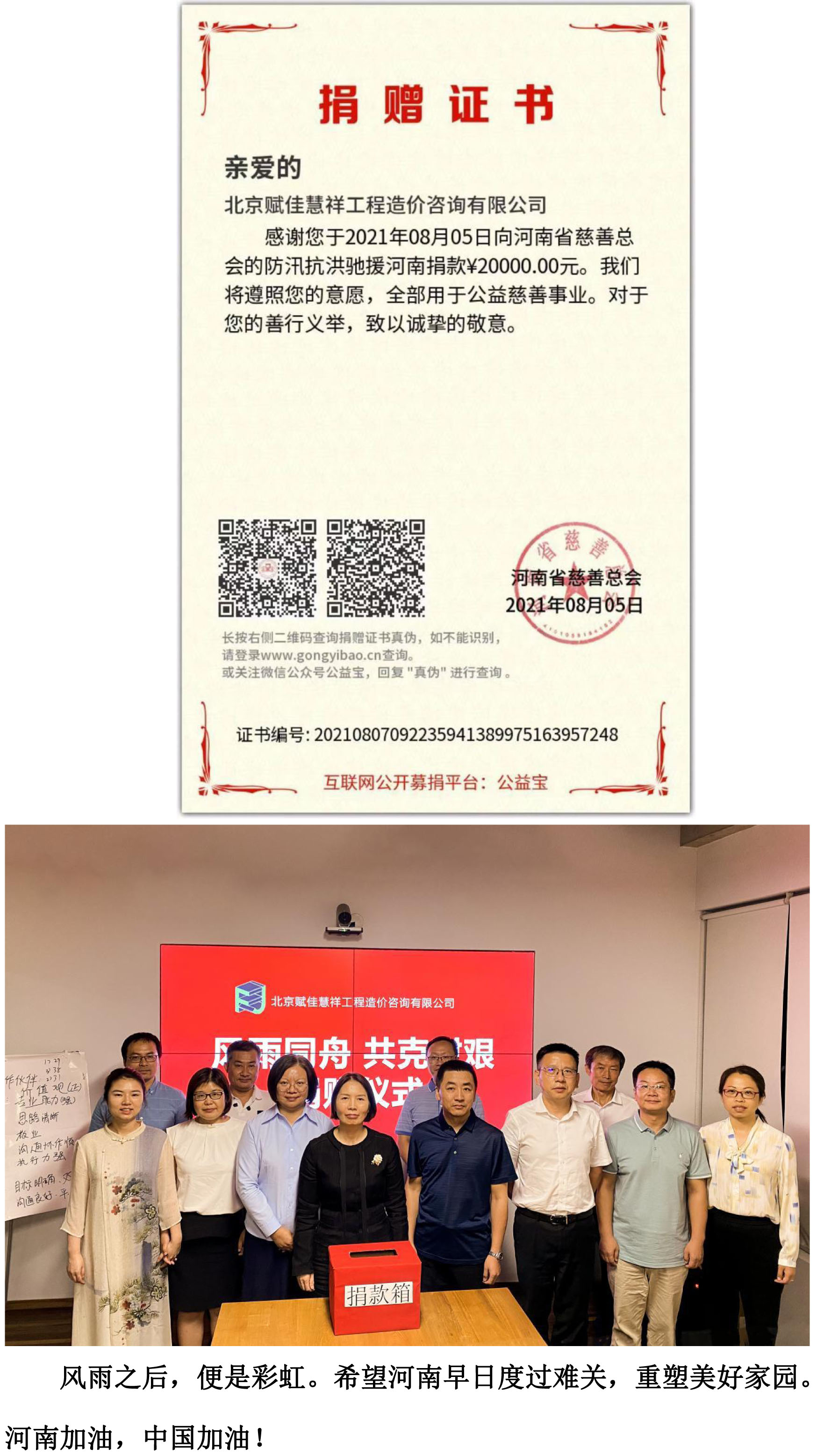 北京赋佳慧祥工程造价咨询有限公司向河南捐款