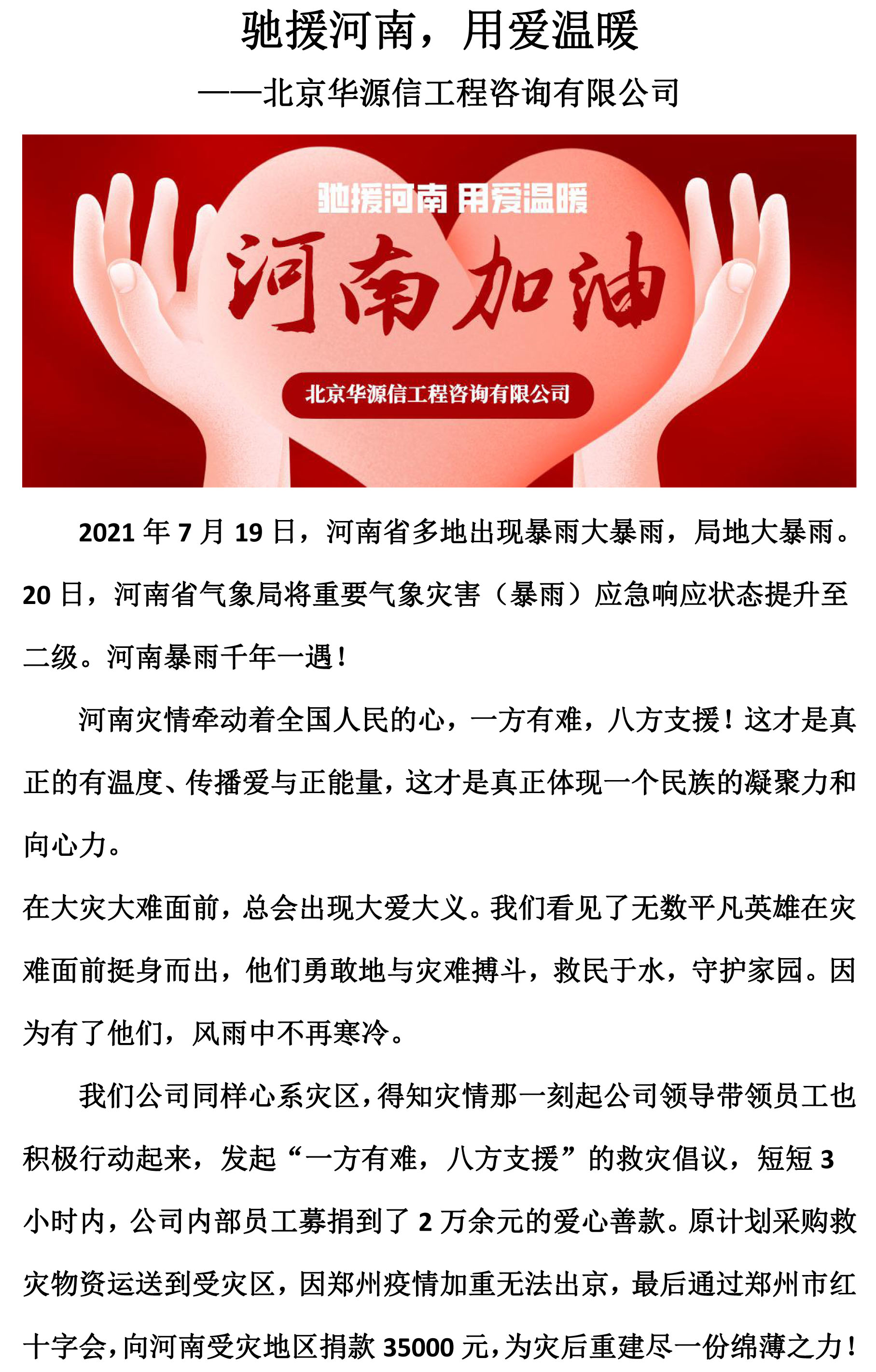 驰援河南,用爱温暖——北京华源信工程咨询有限公司