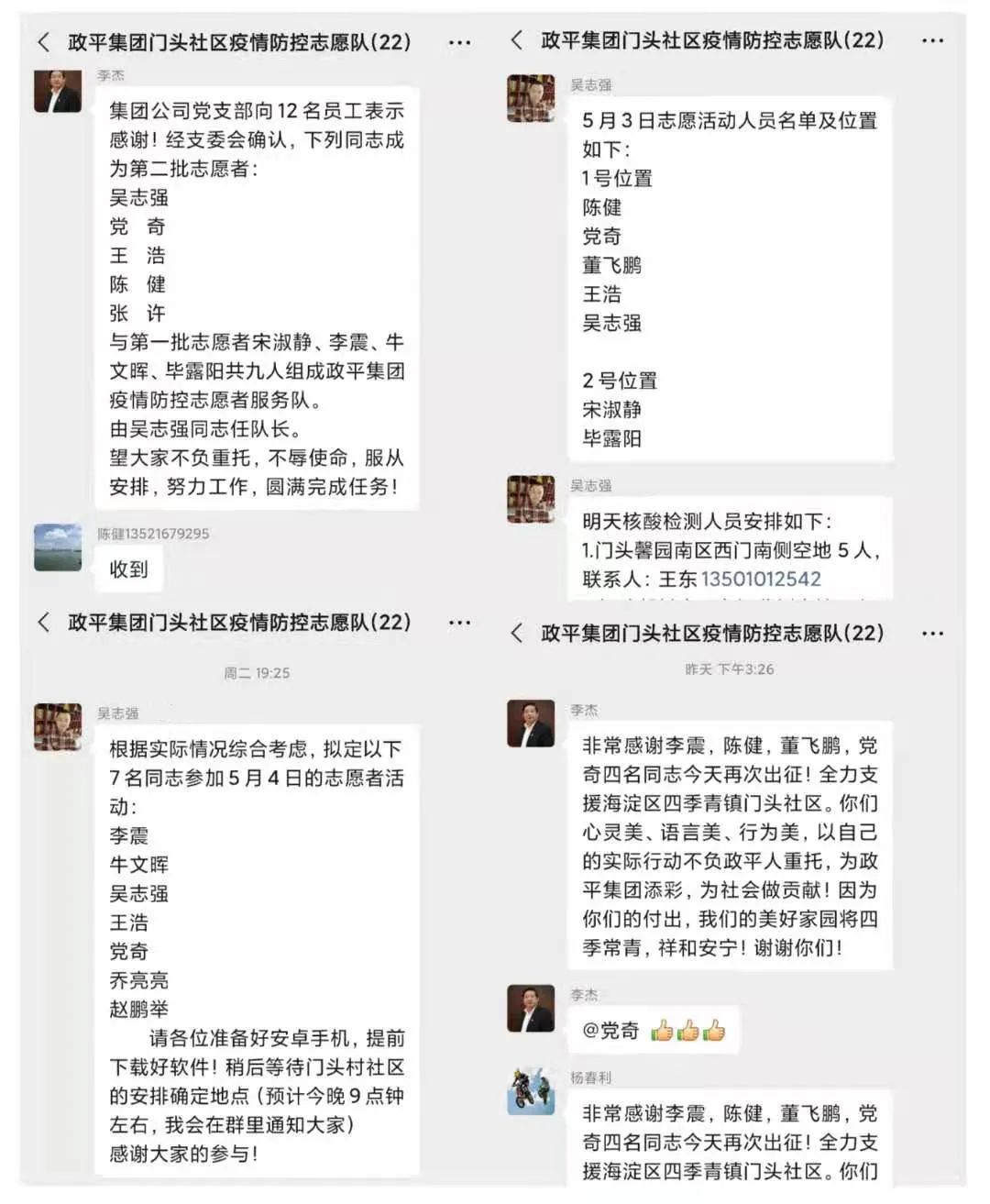 “五一”节日期间,社区核酸检测工作任务增加,政平集团作为北京市非公经济组织党建示范单位,坚持党建引领,担当社会责任,迅速成立了以党员、入党积极分子为骨干的“志愿服务队”。连日来,先后有15名同志积极响应号召、不惧困难,化身“小蓝”和“大白”,与社区工作者并肩作战,在社区的疫情防控工作中大显身手,无私奉献。