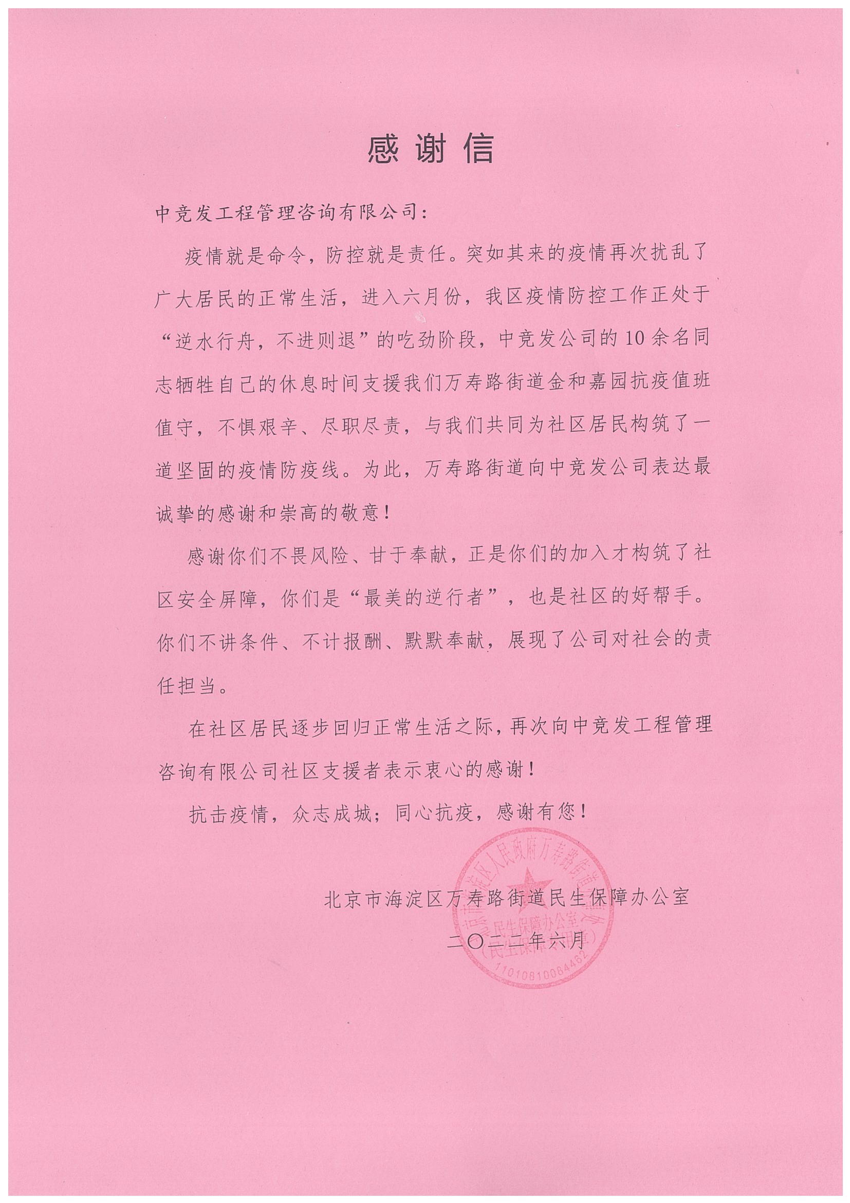 万寿路街道民生保障办公室送给中竞发公司的感谢信