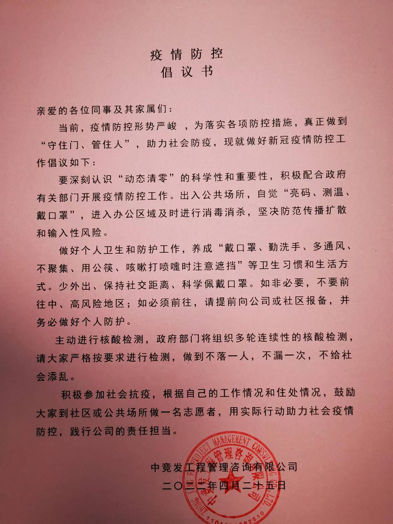 2022年4月下旬以来,北京的疫情来势凶猛,且起伏不定。疫情就是命令,防控就是责任。中竞发工程管理咨询有限公司党支部把疫情防控作为政治任务,积极响应北京市委、市政府的号召,闻令而动,采取支部管总、党员先行、上下联动、整体带动的举措,高标准落实防控要求,得到了海淀区万寿路街道的高度评价。